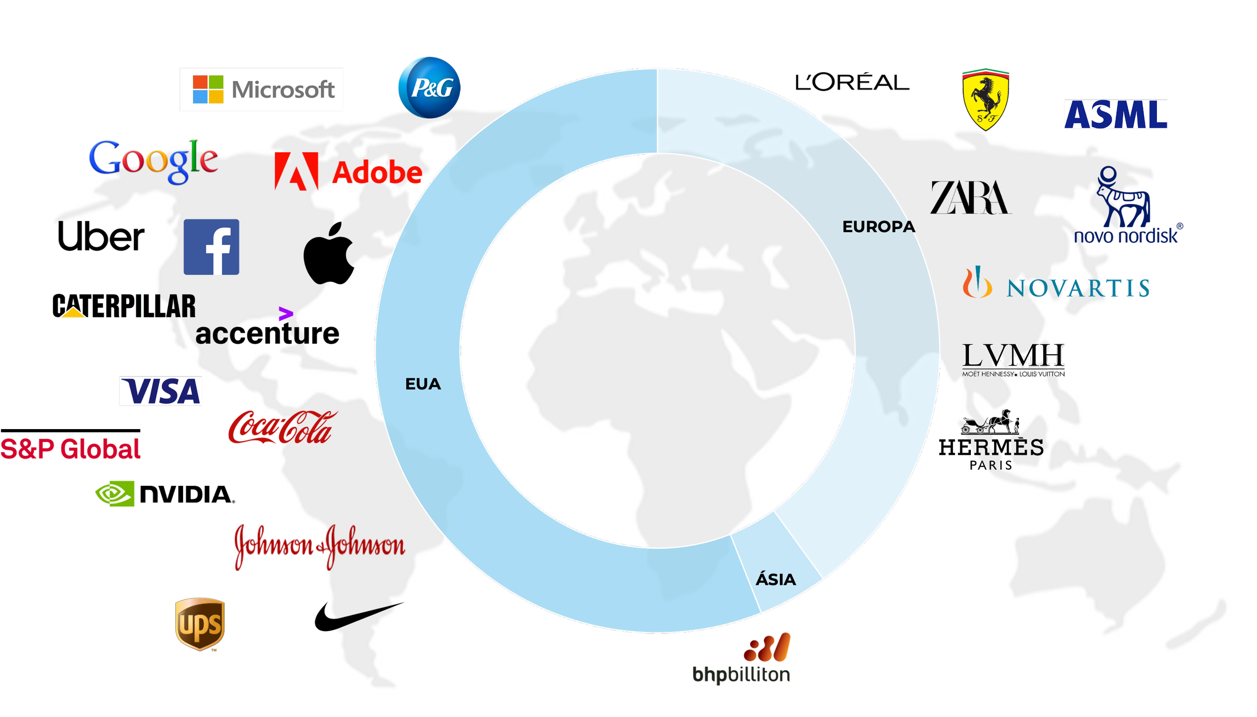 A imagem em baixo mostra a distribuição das empresas líderes em carteira pelo mundo.